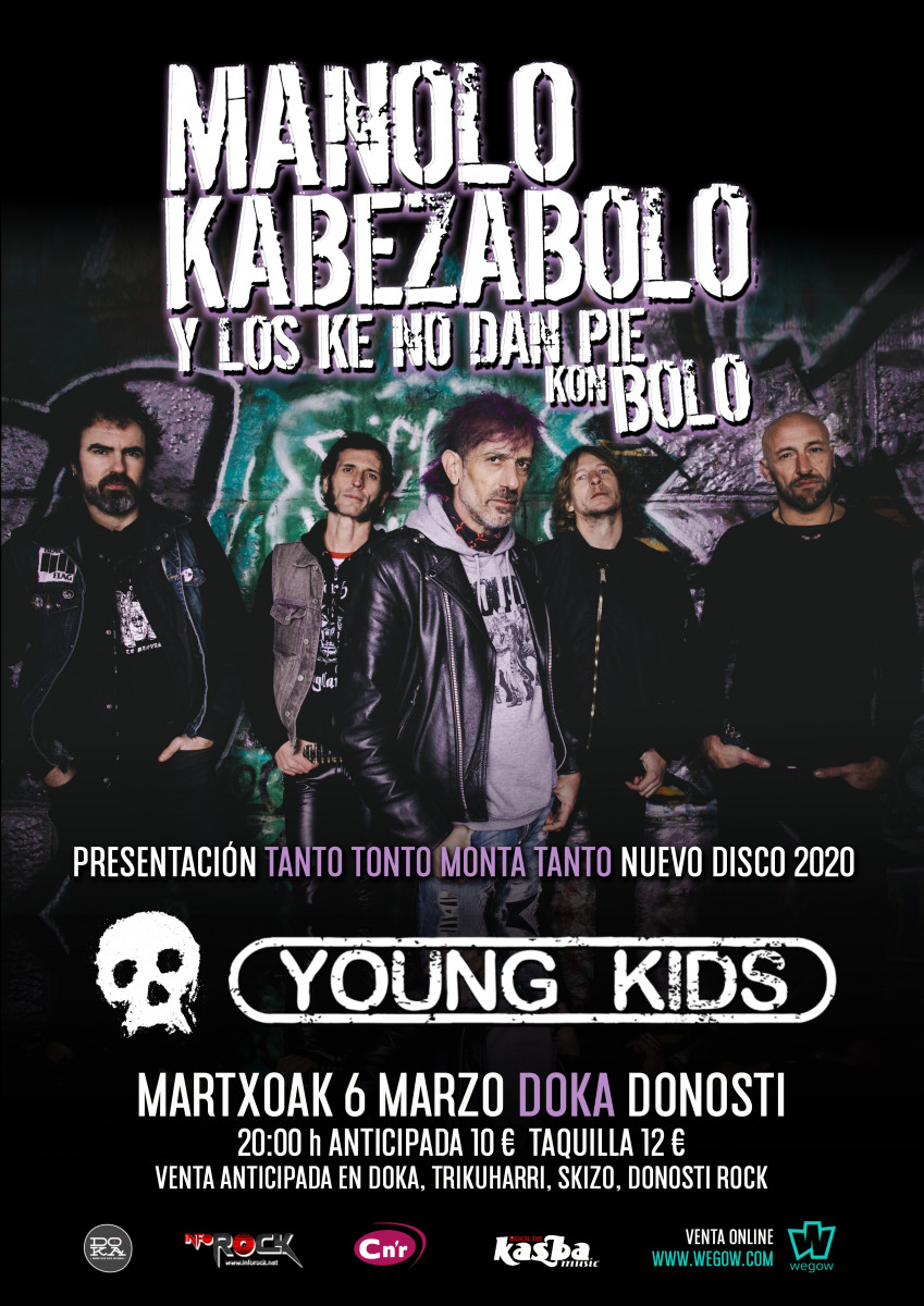 El viernes 6 marzo, Manolo Kabezabolo y los Ke no dan Pie Kon Bolo llega a Doka de Donostia presentando su nuevo CD «Tanto tonto monta tanto», su nuevo CD en estudio tras 6 años sin publicar nuevas canciones. Abrirán cartel los donostiarras Young Kids, nacidos de las cenizas de Sutura.
